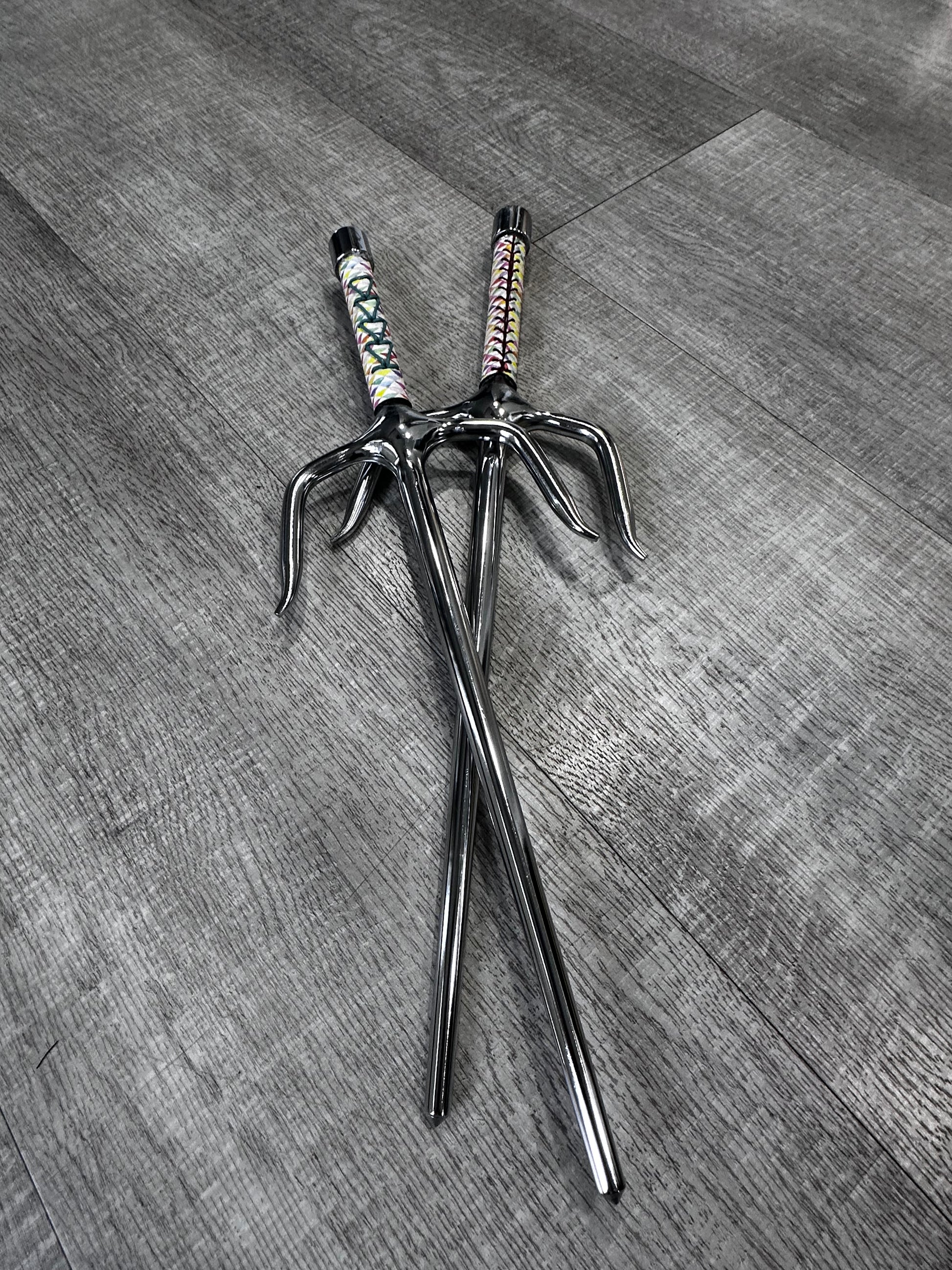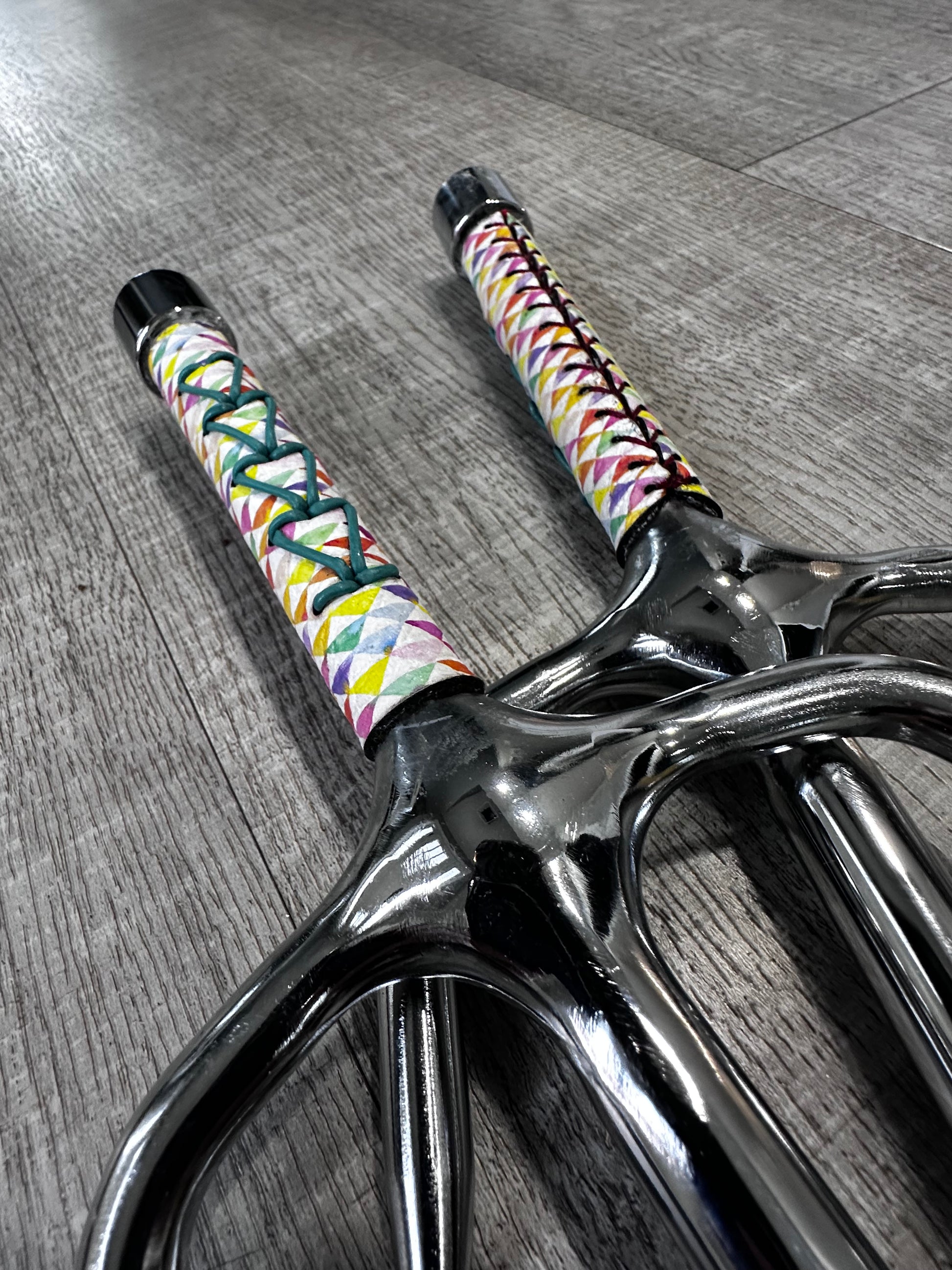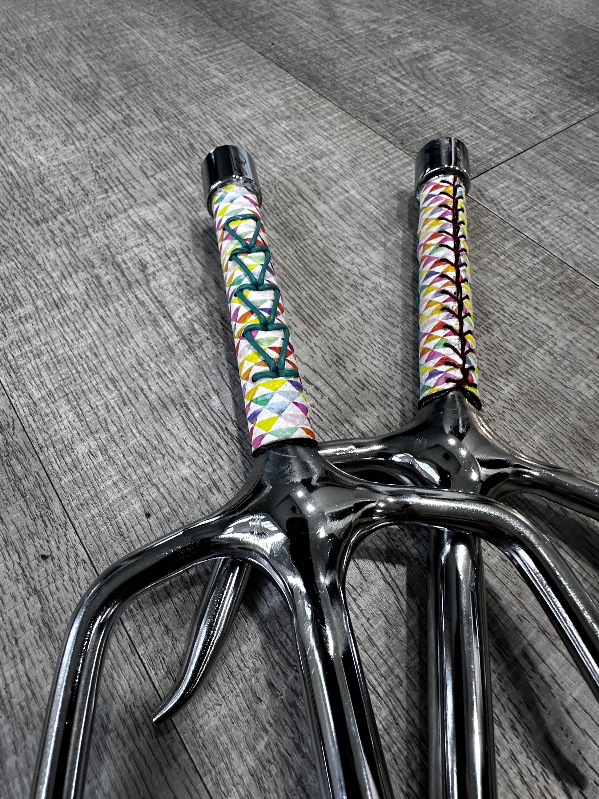 Master the art of traditional weaponry with these striking Arrow Vibe Sai. Featuring vibrant colorful leather adorned with geometric triangle patterns, this pair channels authentic 80's aesthetic while maintaining functional design. Each sai is wrapped with a supple green leather cord for enhanced grip and control. Ideal for martial artists, collectors, and enthusiasts seeking equipment that blends historical tradition with contemporary style. Perfect for training, forms practice, or display.