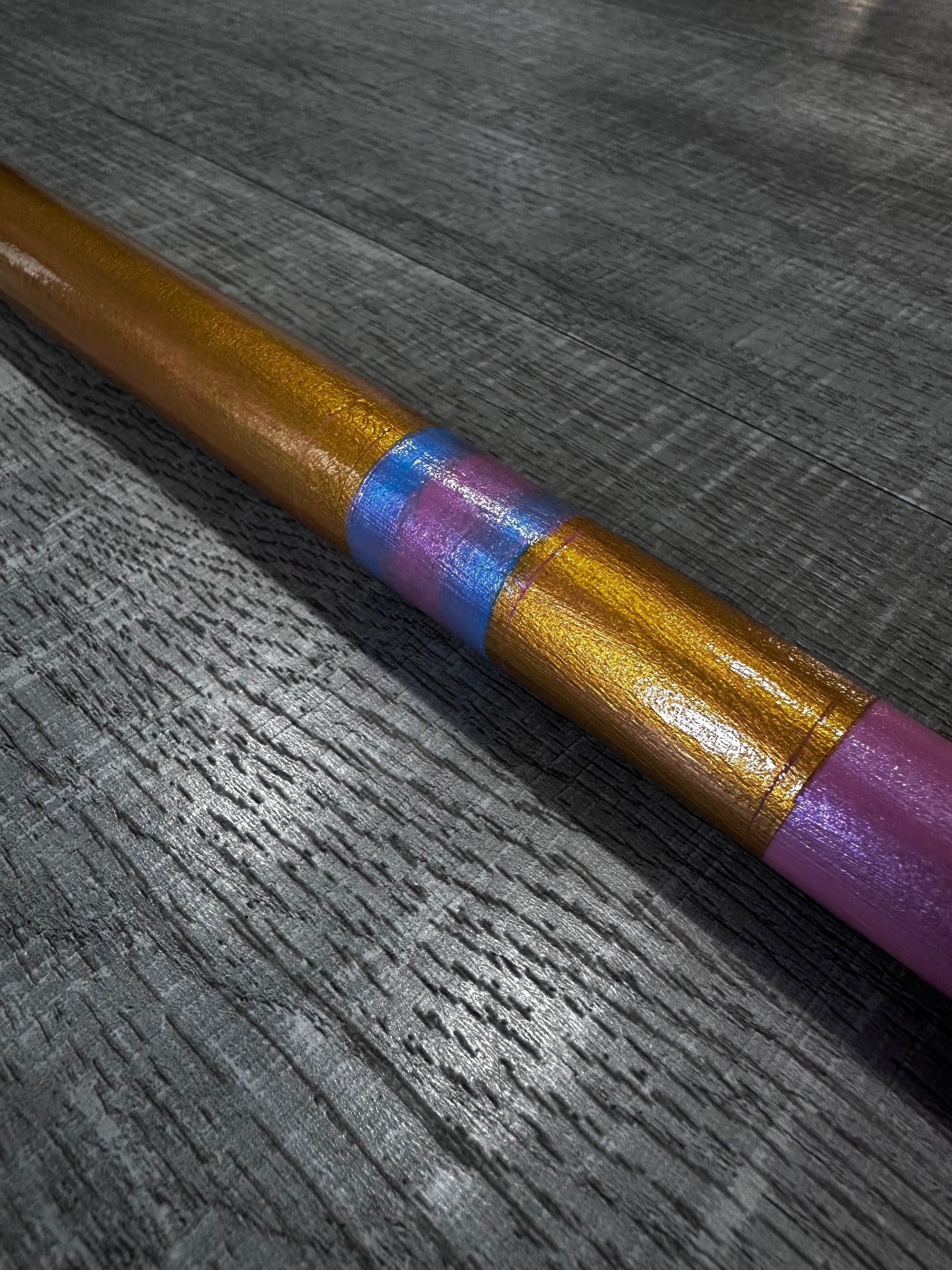 Inspired by the aesthetic of K-pop demon hunters, this striking bo staff features an iridescent finish that shifts between blue and pink hues, accented with intricate gold detailing. Each piece showcases hand-carved elements that add depth and authenticity to the design. The luminous glow creates a captivating visual effect whether displayed or in use, making this staff a standout piece for collectors and enthusiasts of anime-influenced weaponry and pop culture artistry.