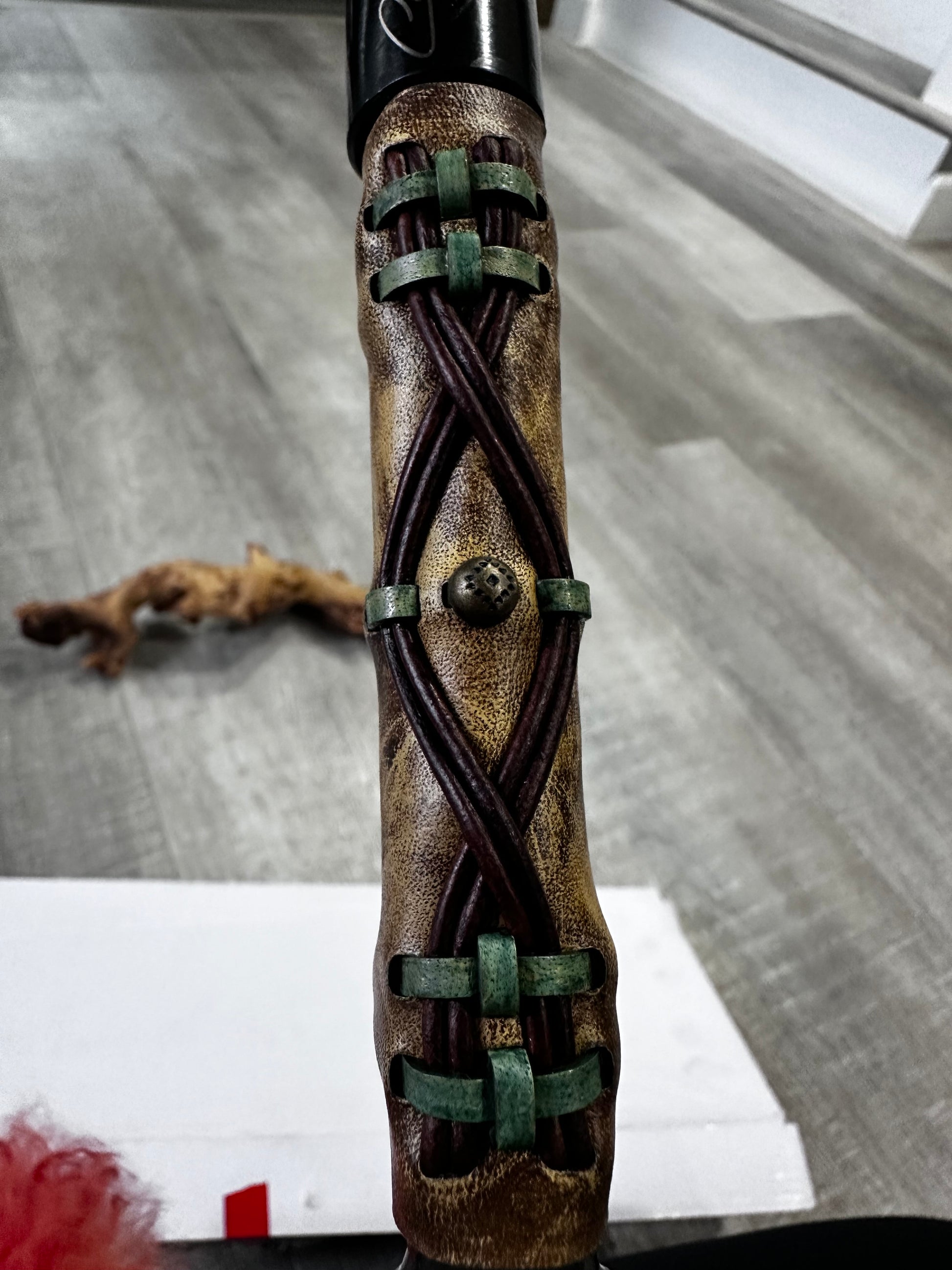 Ludovica Sai showcases artisanal craftsmanship with hand-worked leather construction and intricate detailing. Aged bronze studs provide an understated industrial accent, while leather cord accents add textural depth. Each piece features custom engraving, making it a distinctive accessory that reflects both quality materials and meticulous attention to detail. Perfect for those who appreciate handmade leather goods with character and refinement.