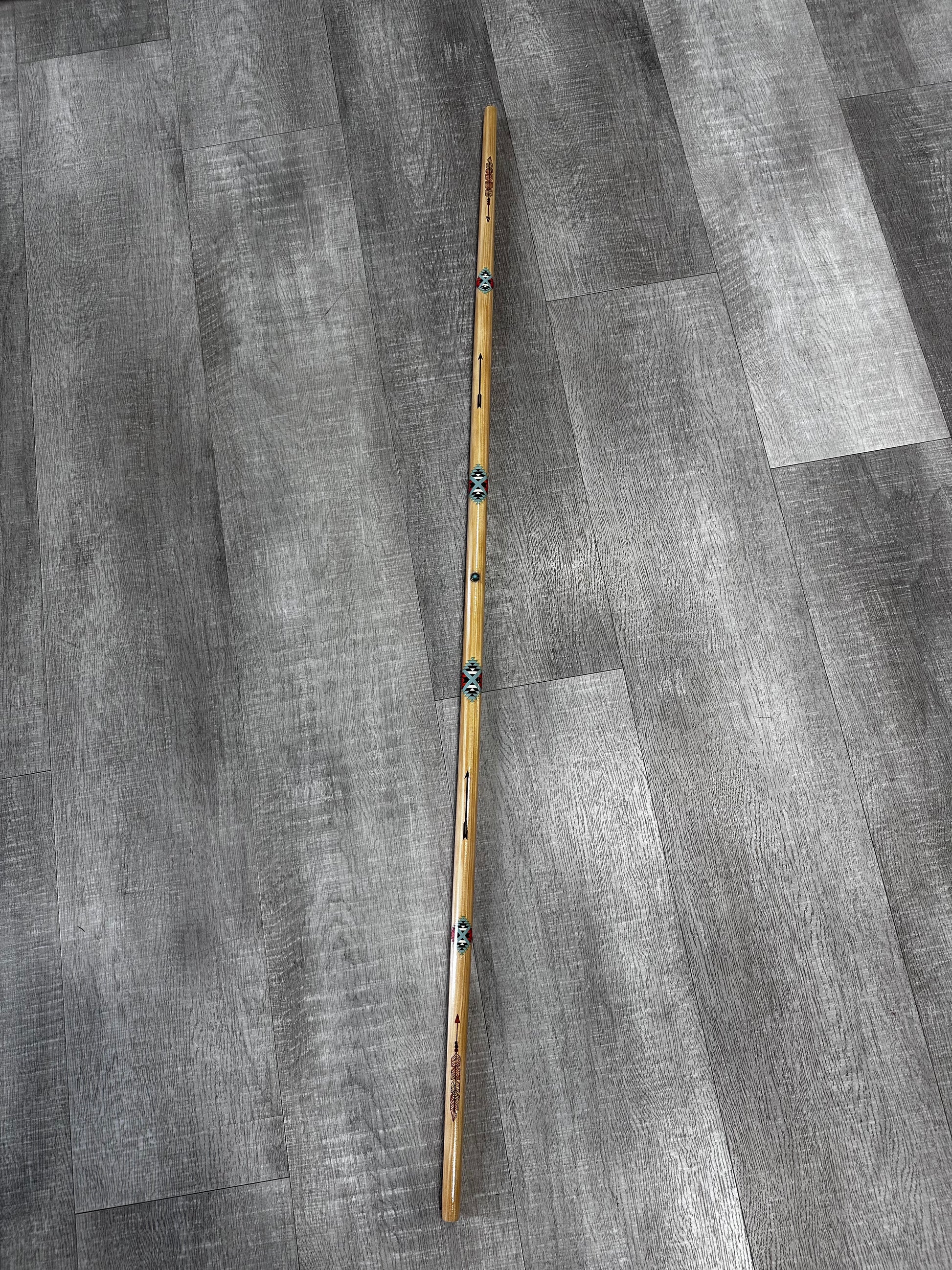 This traditional bo staff showcases authentic Native American artistry, featuring hand-applied arrows and geometric patterns inspired by tribal heritage. A striking turquoise detail adds cultural authenticity and visual depth to the design. Crafted with attention to traditional aesthetics, this staff is ideal for martial artists and collectors who appreciate indigenous craftsmanship. Custom measurements are available upon request, allowing you to tailor the staff to your specific needs and preferences.