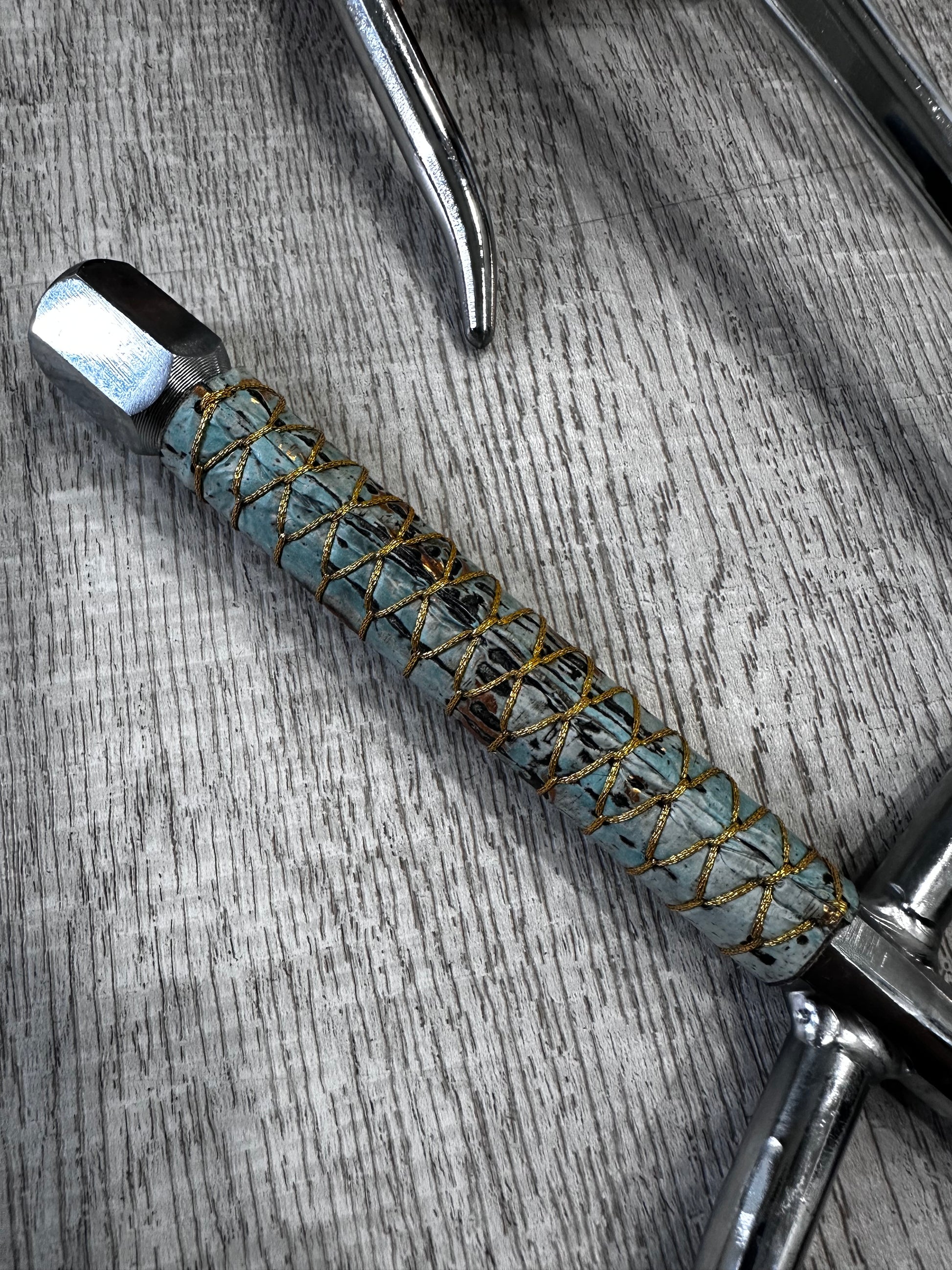 Crafted from premium stainless steel with embossed and printed leather featuring bronze and gold accents over a striking turquoise base. Hand-finished with gold waxed thread detailing, this piece exemplifies meticulous artisanal construction. Each element—from the metal hardware to the decorative stitching—demonstrates the quality and precision expected of a refined accessory.