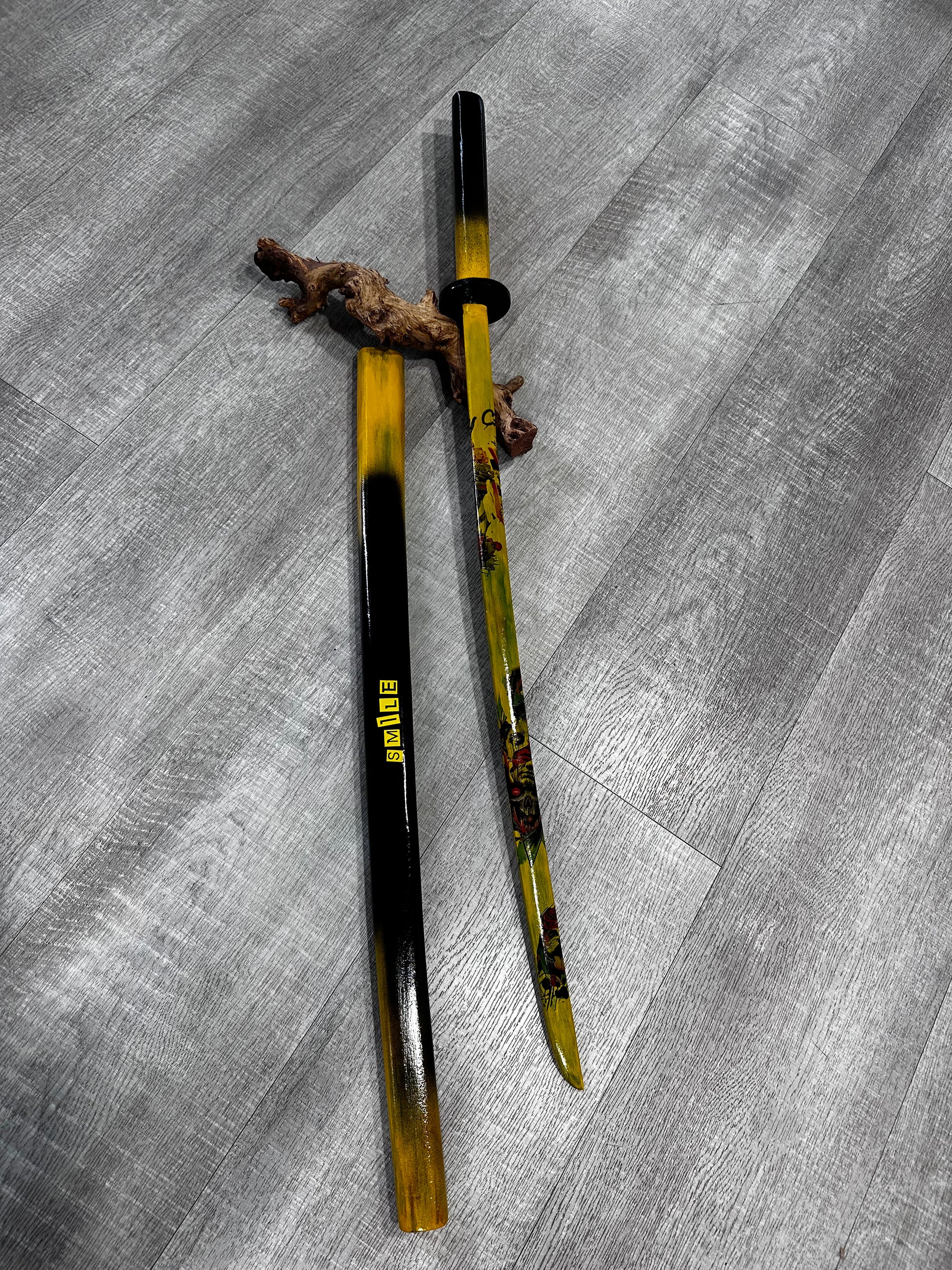 The Smile Bokken combines traditional training design with contemporary street art aesthetics. This wooden practice sword features bold graffiti-style artwork inspired by Basquiat, rendered in striking contrast against a vibrant yellow base, creating a visually distinctive training tool. The matching black and yellow scabbard provides secure storage while complementing the bokken's dynamic finish. Ideal for martial artists seeking equipment that merges classic technique with modern style, this bokken delivers both functional performance and artistic expression for kata practice and training sessions.